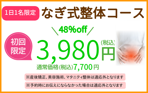 ・初診でお電話やLINEにてご予約の際は、なぎ式整体希望とお伝えください。その際、お名前・希望日・時間・連絡先もご一緒にお願いいたします。